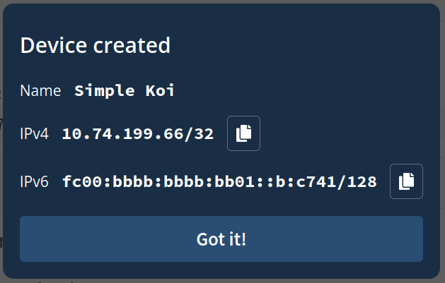 You should see a popup that has the name of your new device, as well as what IPv4 and IPv6 addresses to use for the interface. Copy the IPv4 and IPv6 addresses.