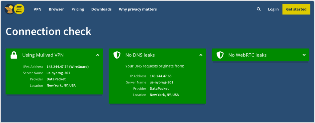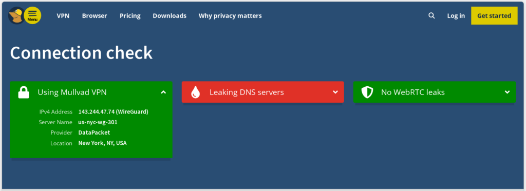 At this point traffic from your LAN interface should be routed via the Mullvad tunnel. You can now navigate to https://mullvad.net/check to test your connection. You should see that you are using Mullvad VPN. Mullvad will likely show you have leaking DNS servers. This is because we have not configured DNS requests to use the tunnel yet. We will address this next.