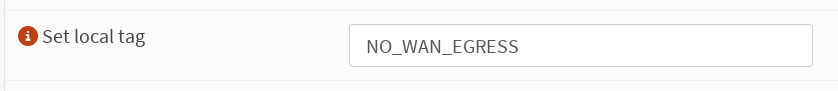 At this point, Mullvad’s connection check will likely still show leaking DNS resolvers. This is because traffic can still leave the firewall via the WAN interface. We will address this by adding a killswitch rule. Go to Firewall: Rules: LAN, and edit the IPv4 rule we configured the Gateway for earlier. Scroll down and expand the “Advanced features” section. Under “Set local tag” add “NO_WAN_EGRESS”. This tags all traffic matching this rule so we can create a rule to prevent it from leaving via the WAN interface. Click “Save”, then click “Apply changes”.