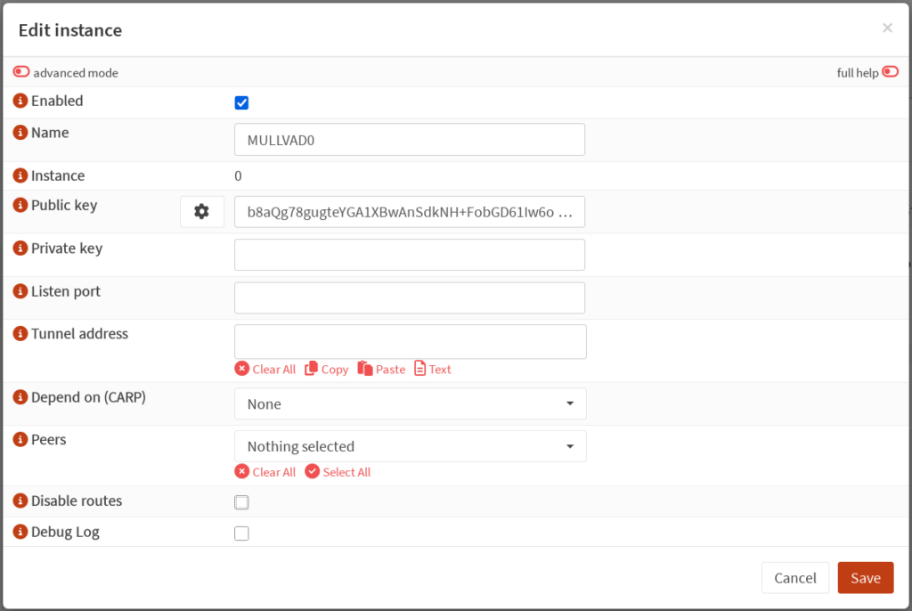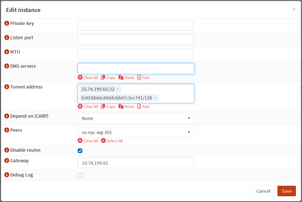 Return to your WireGuard instance configuration, and paste the IPv4 and IPv6 addresses generated by Mullvad into the “Tunnel address” field. Leave the “Listen port” field blank, as this instance will not be listening for connections. Tick the “Disable routes” box as we do not want OPNsense to create default routes for this interface. Enable “advanced mode” at the top of the new instance configuration, then in the “Gateway” field, enter the IPv4 address copied from Mullvad, but subtract one from the last octet. Mullvad instructed me to use an IPv4 address of 10.74.199.66, so for the “Gateway” field I will enter 10.74.199.65. OPNsense documentation has the following note regarding the value for Gateway: