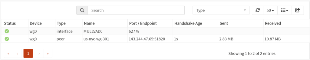 If “Enable WireGuard” is not selected, select it then click “Apply”. If already selected, toggle it (clicking “Apply” in between) to force the interface to be reset. Now, if you navigate to VPN: WireGuard: Status, you should see a green check mark next to your new interface, as well as the time since the last handshake and some other details.