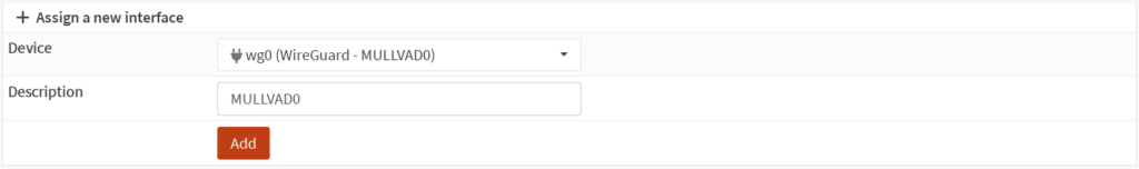 Navigate to Interfaces: Assignments. In the “Device” drop-down, select your new WireGuard instance. Give it a description if not pre-populated, then click “Add”.