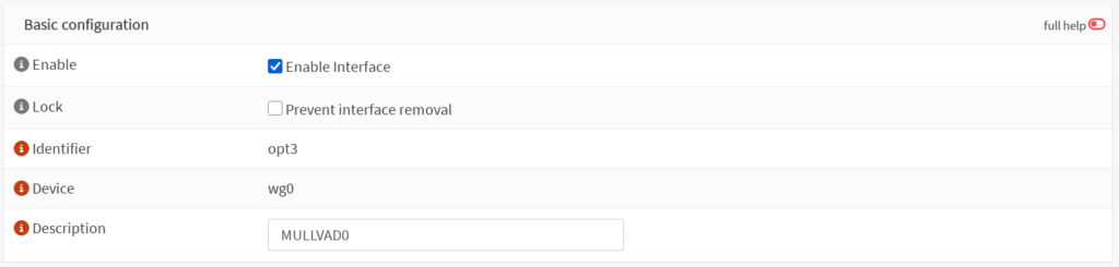 Now you should see a new interface in the “Interfaces” list with the name of your WireGuard instance. Select this new interface, tick “Enable Interface”, click “Save”, then click “Apply changes”. There is no need to further configure this interface.