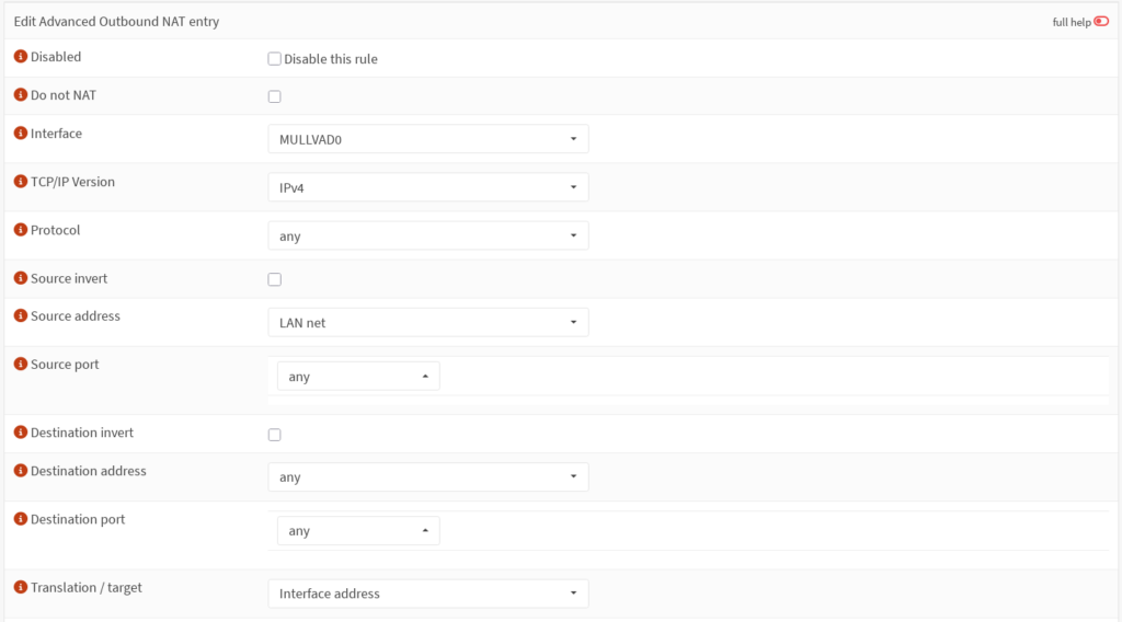Navigate to Firewall: NAT: Outbound. Ensure that either “Hybrid outbound NAT rule generation” or “Manual outbound NAT rule generation” is selected. Add a new outbound rule. Under the “Interface” field, select your WireGuard interface. Under “Source address”, select “LAN net”, or whichever network or alias you wish to tunnel through the VPN. Ensure the “Translation / target” field is set to “Interface address”.