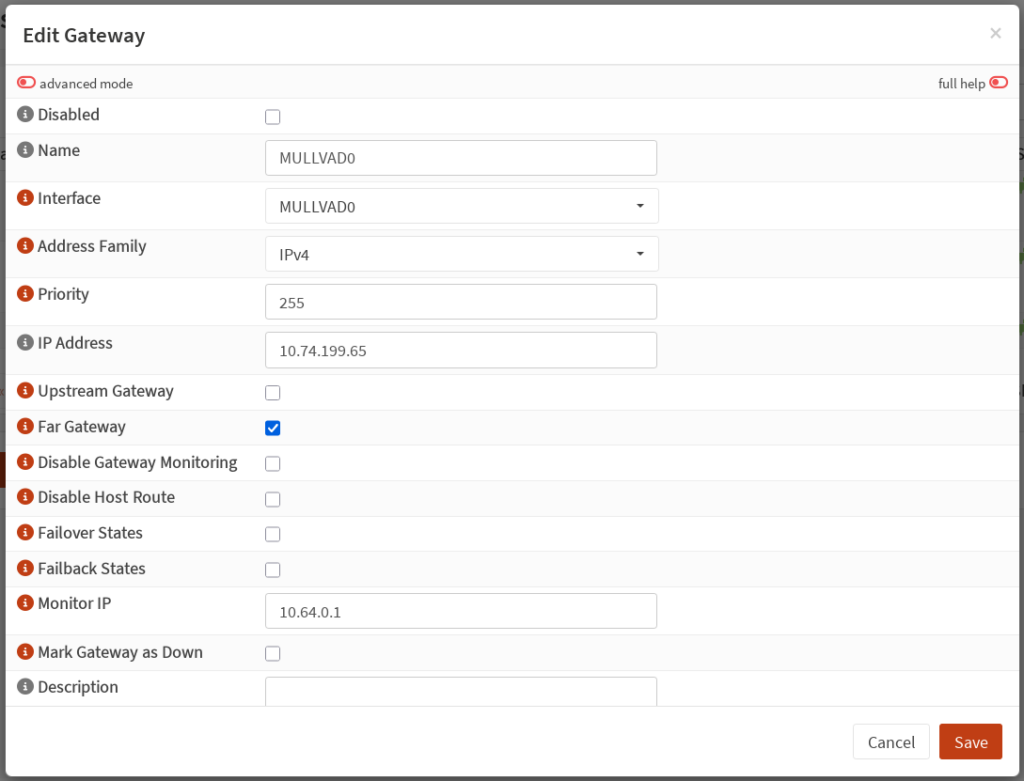 Next we need to create a Gateway for our tunnel. Navigate to System: Gateways: Configuration and add a new gateway. Give it a name, and select the interface created above in the “Interface” drop-down. In the “IP address” field, enter the IPv4 address you used for the “Gateway” field when creating the interface (IP address provided by Mullvad with one subtracted from the last octet). Select “Far Gateway”, and deselect “Disable Gateway Monitoring”. In the “Monitor IP” field, we need to select a different IP address as the gateway IP address is likely not going to respond to pings for reasons outlined above. You can select a public IP address that responds to pings like 1.1.1.1 or 8.8.8.8 here, or you can use Mullvad’s gateway of 10.64.0.1. If you have gateway monitoring enabled on multiple WAN interfaces, it is important that the monitor IP be unique for each gateway.