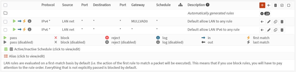 We now need to configure a firewall rule to route traffic from the LAN interface through the tunnel. Go to Firewall: Rules: LAN. You should already have some rules here. OPNsense creates default rules allowing all outbound IPv4 and IPv6 traffic. Edit the default rule for IPv4 traffic (this guide does not cover IPv6). In the Gateway dropdown, select the Gateway created above. Click “Save”, then click “Apply changes”.