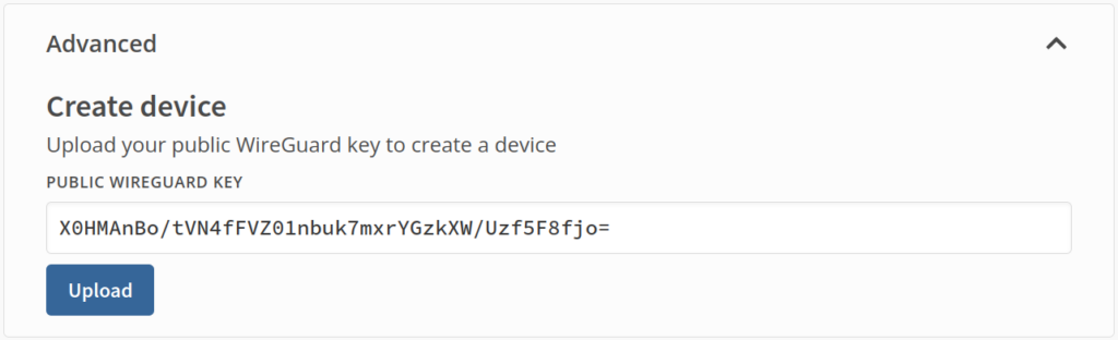 Login to your account on Mullvad’s website, and navigate to “Devices”, under the “Account Management” section. Scroll down to the bottom and expand “Advanced”. Paste the public key generated by OPNsense into the field and press “Upload” to create a new device.