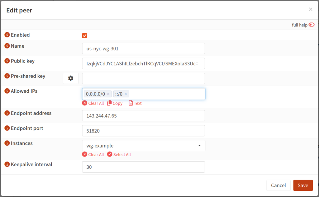 Return to OPNsense, then navigate to VPN: WireGuard: Peers and add a new peer. Paste the public key and IPv4 address copied from Mullvad’s website. Mullvad does not use pre-shared keys so leave this field blank. Give the peer a name. I like to set the name to the name of the server, for instance us-nyc-wg-301. Under “Allowed IPs” add 0.0.0.0/0 and ::/0. These respectively mean that all IPv4 and IPv6 destinations are eligible to be tunneled through this interface. Set the endpoint port to 51820. Under the “Instances” dropdown, select the WireGuard instance you created above. “Keepalive interval” can be left blank or set to a value in seconds, say 30. Click “Save”, then click “Apply”.
